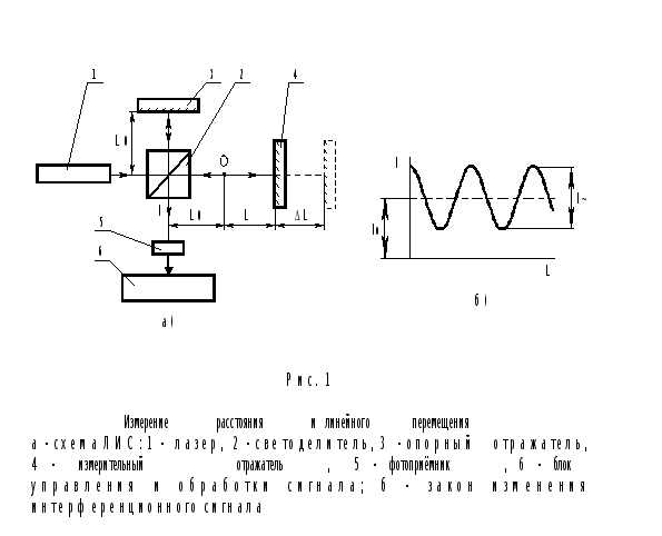 Рассматривая принципы и методы измерения, излучение лазера 1 будем считать идеальной плоской волной. Интерферометр, состоящий из светоделителя 2, опорного отра- жателя 3 и измерительного отражателя 4, настроен на бесконечно широкую полосу. Интенсивность интерференционного сигнала I на фо- топриемнике 5 изменяется по закону (рис. 1б) I=I0 +I~ * COS (4pL/l), (1) где I0 и I~ - постоянная составляющая и амплитуда переменной сос- тавляющей сигнала соответственно; 2L - геометрическая разность хода интерферирующих пучков; l - длина волны излучения. Расстояние от нуля интерферометра О до измерительного отра- жателя 4: