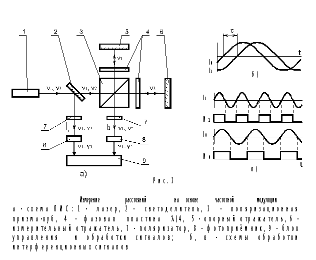 На рис. 3а приведен пример схемы ЛИС. Двухчастотный лазер 1 излучает две волны с частотами n1 и n2, одна из которых поляризо- вана параллельно, а другая - перпендикулярно плоскости чертежа. Светоделитель 2 отклоняет часть излучения каждой частоты для фор- мирования опорного сигнала I0 . Поляризационная призма-куб 3 раз- деляет составляющие излучения разных частот и направляет их в разные плечи интерферометра. Пластины l/4 - позиция 7, оптические оси которых составляют угол 450 с плоскостью чертежа, меняют сос- тояние поляризации дважды прошедших пучков на ортогональное. По- ляризационная призма-куб 3 обеспечивает суперпозицию пучков, возвращенных отражателями 4 и 5, в направлении I1 . После поляри- заторов 6, ось пропускания которых составляет угол 450 с плос- костью чертежа, в результате интерференции пучков с разными час- тотами образуются опорный I0 и измерительный I1 сигналы биения. Поскольку номенклатура двухчастотных лазеров и значения раз- ности частот, которые они обеспечивают, ограничены, в качестве источника излучения часто используют одночастотный лазер, сдвигая частоты ортогональных составляющих его излучения акустооптически- ми модуляторами, которые устанавливают на входе, выходе или в од- ном из плечей интерферометра . В этом случае опорный сигнал I0 может быть получен непосредственно из модулирующих сигналов, подаваемых на акустооптические модуляторы. Частота частотной модуляции, аналогично частоте фазовой модуляции, ограничивает время измерения . Однако при использовании акустооптических модуляторов она может быть установлена достаточно большой, чтобы этим ограничением можно было пренебречь. Тогда время однократного измерения фазы определяется временем задержки фазоизмерительного устройства и составляет для современных ЛИС около 10 мкс . Так как ЛИС на основе частотной модуляции обеспечивают время измерения на порядок меньше, чем ЛИС на основе фазовой модуляции, допустимые скорости изменения ГРХ в них на порядок выше. Эти ЛИС считаются в большей степени подходящими для высокоточных измерений в реальном масштабе времени . При равной погрешности они имеют несколько больший диапазон измерения ГРХ. На основе методов прямого измерения фазы разрабатывают ЛИС для измерения медленно меняющихся во времени и незначительных по величине расстояний с высокой точностью. Основная область применения таких ЛИС - контроль профиля и шероховатости поверхностей, в том числе оптических. Другая обширная сфера применения - интерференционные датчики физических величин, изменение которых можно преобразовать в изменение еометрической или оптической разности хода интерферирующих лучей (давление и влажность атмосферы, температура, напряженность электрического и магнитного полей и др.). Частотную модуляцию интерференционного сигнала обеспечивают путем суперпозиции двух волн разной оптической частоты. В этом случае закон изменения интенсивности имеет вид