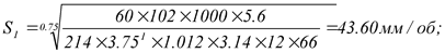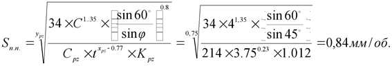 Подача, допустимая жесткостью державки резца. г ypz = 0,75., показатель степени в главной составляющей силы резания; H=20 мм., высота корпуса державки резца; B=25 мм., ширина державки резца ; Сpz =214, коэффициент (по карте 11[ 9] ); txpz = 3,751.0 мм., глубина резания в мм.; Kpz - поправочный коэффициент на Pz. l =37,5 мм., длина вылета резца. По черновой обработке: f = 0,1., величина прогиба вершины резца; Е= 20´103 кг/м3 .,модуль упругости материала.