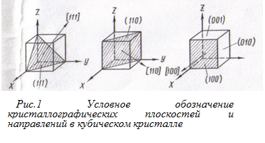 кристалле будут иметь обозначения (100),(110) и (111)(рис. 1 — заштрихованные плоскости). Вследствие симметричности в кубическом кристалле имеются семейства эквивалентных плоскостей, которые обозначают индексами, заключенными в фигурные скобки. Например, три граникуба (001),(010) и (100) можно обозначить {100}. Направления в кристалле обозначают индексами, заключенными в квадратные скобки, например [111]. Совокупность эквивалентных на