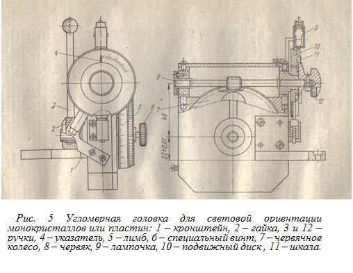 Техническая характеристика установки ЖК 78.08: Размеры слитков, мм: максимальный диаметр ............... 60 длина ............................................... 80 Минимальный размер пластин (кристаллов), мм .................................................... 1,5х1,5 Точность ориентации: кремния ........................................... ±3´ германия ......................................... ±15´ Цена деления шкалы экрана: для кремния ................................... 3´ для германия ................................. 15´ угломерной головки .................... 1´ Источник света (лампа накаливания), Вт .................................................... 30 Применяемая энергетика (сеть переменного тока): напряжение, В .............................. 220 частота, Гц ................................... 50 Габаритные размеры, мм .......... 575х288х550 Масса, кг ...................................... 35 Угломерная головка (рис. 5) состоит из червячного редуктора, у которого на червяке 8 имеется ручка 12 с указателем 4, а на червячном колесе 7 – лимб 5. Указатель на ручке, закрепленной на червяке, указывает угол поворота образца (угол отклонения кристаллографической плоскости) по шкале 11, закрепленной на подвижном диске 10. Лимб, посаженный на вал червячного колеса, можно вращать независимо от вращения червячного колеса или совместно с червячным колесом, если застопорить лимб специальным винтом 6, ввернутым в торец вала. Вал червячного колеса с конца, противоположного лимбу, имеет цангу, которая с гайкой 2 образует цанговый зажим, приводимый в действие ручкой 3. Цанговый зажим предназначен для жесткого соединения вала детали, имеющей безировочную плоскость, с угломерной головкой. Для подсветки шкалы и лимба имеются две электрические лампочки 9. Шкала предназначена для отсчета углов отклонения кристаллографических плоскостей, не превышающих двух градусов, а лимб – свыше двух градусов. Крепится угломерная головка к подвижной плите кронштейном 1. Оптическая система установки (рис. 6) состоит из источника света, конденсатора, зеркал, объектива, диаграммы и экрана. Луч света в оптической системе проходит от источника света 1 (лампа накаливания СЦ-68 8 В, 30 Вт) через конденсор 2 (представляющего собой систему