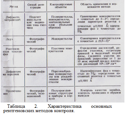 . В технологии производства полупроводниковых приборов рентгеновские методы применяются в первую очередь для ориентировки монокристаллов — германия, кремния, арсенида галлия, сапфира и др., а также для анализа дефектов указанных материалов и полупроводниковых структур. В меньшей степени используется фазовый анализ металлов и сплавов, флуоресцентная спектрометрия, просвечивание материалов и полупроводниковых структур или приборов, а также методы рентгеновского микроанализа. Характеристика основных рентгеновских методов приведена в табл. 2