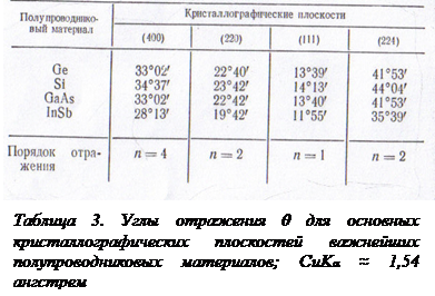 Зная dh,k,lрассчитывают значение угла θ для соответствующей системы плоскостей. При этом учитывают, что вследствие особенностей структуры типа алмаза для некоторых плоскостей отражение низких порядков (n = 1, 2 и т.д.) могут гаситься. Значение углов θ для ряда материалов, наиболее широко применяющихся при разработках и производстве приборов, приведены в таблице 3 (обычно используют излучение меди – линия CuKα, где λ = 1,539 ангстрем).