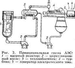 Принципиальная схема АЭС с ядерным реактором, имеющим водяное охлаждение, приведена на рис. 2. Тепло, выделяется в активной зоне реактора, теплоносителем, вбирается водой (теплоносителем 1-го контура), которая прокачивается через реактор циркуляционным насосом 2. Нагретая вода из реактора поступав в теплообменник (парогенератор) 3, где передаёт тепло, полученное в реакторе воде 2-го контура. Вода 2-го контура испаряется в парогенераторе, и образованный пар поступает в турбину 4.