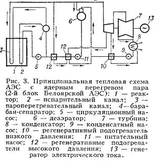 В высокотемпературных графито-газовых реакторах возможно применение обычного газотурбинного цикла. Реактор в этом случае выполняет роль камеры сгорания. При работе реактора концентрация делящихся изотопов в ядерном топливе постепенно уменьшается, и топливо выгорает. Поэтому со временем их заменяют свежими. Ядерное горючее перезагружают с помощью механизмов и приспособлений с дистанционным управлением. Отработавшее топливо переносят в бассейн выдержки, а затем направляют на переработку. К реактору и обслуживающим его системам относятся: собственно реактор с биологической защитой, теплообменники, насосы или газодувные установки, осуществляющие циркуляцию теплоносителя; трубопроводы и арматура циркуляции контура; устройства для перезагрузки ядерного горючего; системы спец. вентиляции, аварийного расхолаживания и др. В зависимости от конструктивного исполнения реакторы имеют отличительные, особенности: в корпусных реакторах топливо и замедлитель расположены внутри корпуса, несущего полное давление теплоносителя; в канальных реакторах топливо, охлаждаемые теплоносителем, устанавливаются в спец. трубах-каналах, пронизывающих замедлитель, заключённый в тонкостенный кожух. Такие реакторы применяются в России (Сибирская, Белоярская АЭС и др.), Для предохранения персонала АЭС от радиационного облучения реактор окружают биологической защитой, основным материалом для которой служат бетон, вода, песок. Оборудование реакторного контура должно быть полностью герметичным. Предусматривается система контроля мест возможной утечки теплоносителя, принимают меры, чтобы появление не плотностей и разрывов контура не приводило к радиоактивным выбросам и загрязнению помещений АЭС и окружающей местности. Оборудование реакторного контура обычно устанавливают в герметичных боксах, которые отделены от остальных помещений АЭС биологической защитой и при работе реактора не обслуживаются, Радиоактивный воздух и небольшое количество паров теплоносителя, обусловленное наличием протечек из контура, удаляют из необслуживаемых помещений АЭС спец. системой вентиляции, в которой для исключения возможности загрязнения атмосферы предусмотрены очистные фильтры и газгольдеры выдержки. За выполнением правил радиационной безопасности персоналом АЭС следит служба дозиметрического контроля. При авариях в системе охлаждения реактора для исключения перегрева и нарушения герметичности оболочек ТВЭЛов предусматривают быстрое (в течение несколько секунд) глушение ядерной реакции; аварийная система расхолаживания имеет автономные источники питания. Наличие биологической защиты, систем специальной вентиляции и аварийного расхолаживания и службы дозиметрического контроля позволяет полностью обезопасить обслуживающий персонал АЭС от вредных воздействий радиоактивного облучения. Оборудование машинного зала АЭС аналогично оборудованию машинного зала ТЭС. Отличительная, особенность большинства АЭС — использование пара сравнительно низких параметров, насыщенного или слабо перегретого. При этом для исключения эрозионного повреждения лопаток последних ступеней турбины частицами влаги, содержащейся в пару, в турбине устанавливают сепарирующие устройства. Иногда необходимо применение выносных сепараторов и промежуточных