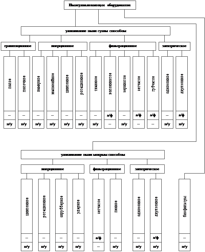 Примечание. Знак «+» означает применение; знак «-» означает неприменение. Пылеулавливающее оборудование, в котором отделение пыли от воздушного потока осуществляется последовательно в несколько ступеней, отличающихся по принципу действия, конструктивным особенностям и способу очистки, относят к комбинированному пылеулавливающему оборудованию. Классификация пылеулавливающего оборудования согласно ГОСТ 12.2.043-80 приведена на схеме. На схеме дополнительно показан вид пылеулавливающего оборудования – биофильтр, применяемый для очистки выбросов, от ряда органических пылей.