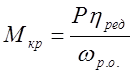 где Р - мощность электродвигателя, кВт; ηред - К.П.Д редуктора. η=0.90 ; ωр.о. – угловая скорость рабочего органа , с-1 ; Частота вращения n об/сек ротора с лопастями известна из таблиц 2-7 приложение методички. Число оборотов рабочего органа в минуту