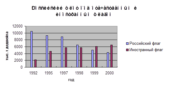 Флот под иностранными флагами, контролируемый Россией, увеличился заэтот же период на 25% и составляет уже более половины всего отечественного флота (54%). Если сравнить уровень конкурентноспособности действующих российских судов с зарубежными, то сравнение будет не в пользу первых. Наши суда, как правило, имеют больший расход топлива и численность экипажа, значительная часть судов морально и физически устарела – всё это сказывается на затратах по судам и стоимости фрахта. Сравнивая объёмы списания и пополнения флота за последние три года, необходимо отметить, что число списанных судов превышает число пополненных. В 1997 г. флот России уменьшился на 2,5 млн. т дедвейта, а пополнился всего на 0,2 млн. т. В 1998 г. выбыло 1,5 млн. т дедвейта, а пополнение составило 0,8 млн. т. При этом необходимо отметить, что 95% списанных судов были под российским флагом.