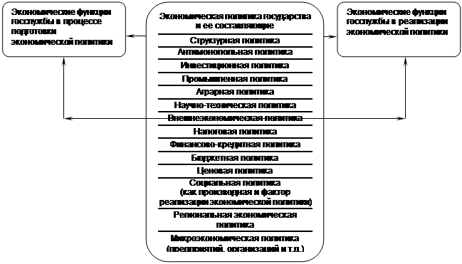 Рис. 1. Классификация экономических функций института государственной службы по составляющим экономической политики В свою очередь, экономические функции института государственной службы (по подготовке и реализации структурной, антимонопольной, инвестиционной политики и т.д.) по своему назначению и природе могут быть регулирующими, стимулирующими, контрольными. Такое подразделение экономических функций необходимо и полезно с точки зрения поиска и определения наиболее эффективного механизма их реализации. В качестве самостоятельной, прежде всего в условиях переходного периода, следует выделять также консультационную функцию института государственной службы, которая особо важна при разработке и реализации экономически политики предприятия. Остановимся на этой проблеме подробнее. Говоря о социально-экономическом положении России, его кризисном состоянии и возможных перспективах, политики, ученые и практики, как правило, связывают эту проблему, например, с федеральным центром и регионами, их взаимодействием и синхронизацией действий, бюджетом, налогами, иностранными инвесторами, выборами губернаторов и т.д. Все это очень важные компоненты, но при этом первоисточник и основа развития общества остаются в тени. Имеется в виду материальное производство, а значит, предприятия, где оно берет начало и заканчивается в виде конкретных результатов (продукции, услуг, прибыли и т.д.). Внимание к предприятиям со стороны государства и его органов явно ослаблено. Их вспоминают в лучшем случае лишь тогда, когда речь идет о задолженностях по зарплате, криминальных ситуациях, банкротстве или неуплате налогов. Думается, что это, мягко говоря, ошибочная позиция, ибо все (или почти все) в социально-экономическом плане в общество зависит как раз от предприятий, итогов их работы. В этой связи возникает вполне логичный, но не такой простой, как кажется на первый взгляд, вопрос: должно ли государство вмешиваться в деятельность предприятий и организаций, учитывая, что в настоящее время уже имеется, как известно, широкий спектр форм их собственности и хозяйствования (частные, акционерные, совместные, арендные, кооперативные и т.п.)? Должно ли и может ли, допустим, государство регулировать и вмешиваться в хозяйственную деятельность и социальное развитие частного предприятия? На наш взгляд, и может, и должно. Допускаем, что не все с этим согласны. Поэтому попытаемся коротко пояснить данный тезис. Во-первых, и это, видимо, бесспорно, именно от результатов работы предприятий зависят и макроэкономические показатели (национальный доход, ВВП, ВНП), и федеральный и региональные бюджеты (их доходная часть), и социальное положение населения (заработная плата, пенсии, занятость, уровень жизни и социальной защиты населения), а значит, в конечном счете, и судьба реформ и России в целом. В этом контексте быть безучастным и равнодушным к положению предприятий сродни самоубийству. Другое дело, что формы государственного вмешательства и государственного регулирования в условиях рынка в отношении прежде всего негосударственных предприятий и организаций должны быть иного, нежели прежде, качества. Основной формой государственного регулирования деятельности предприятий независимо от форм собственности и хозяйствования в настоящее время целесообразно рассма