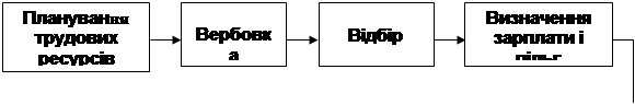 Рис. 1. Управління трудовими ресурсами. Планування майбутніх потреб у кваліфікованому персоналі . Планування здійснюється в три етапи. При плануванні спочатку доцільно оцінити існуючих працівників . Потрібно з'ясувати, який обсяг робіт виконує один працівник, з якою якістю? Які міри треба почати, щоб змінити при необхідності положення справ, зробити перестановки, перерозподілити обов’язки і повноваження, тобто оптимізувати роботу вже наявного персоналу. Для оцінки якості праці працівників іноді застосовуються спеціальні системи інвентаризації, що реєструють інформацію, стосовно набуття працівниками нових навичок. Далі важливим етапом планування є прогнозування . Які фахівці будуть потрібні і коли? Відповідно до цілей і задач організації визначаються майбутні потреби в працівниках. Якщо організація збирається незабаром відкривати ще один підрозділ, то доцільно задуматися про набір потенційних кандидатів уже зараз. Обов'язково враховуються зміни в зовнішньому середовищі, тому що зовнішнє середовище впливає на організацію, на її роботу. Визначивши з потребами, можна розробляти план їх задоволення . План повинен містити всі заходи, необхідні для набору, наймання, навчання, просування для досягнення поставлених цілей і задоволення прогнозованих потреб. При плануванні, крім цілей організації і програм по їх виконанню, необхідно враховувати ще такий фактор, як Законодавство. Воно обумовлює умови наймання і звільнення, умови праці (техніка безпеки), мінімальний розмір оплати праці і т.д. Перед тим як почати процес набору, потрібно чітко визначити майбутні обов'язки працівника. У противному випадку є ризик найняти працівника, особисті і професійні якості якого не зовсім або зовсім не відповідають необхідним. Керівник повинен детально вивчити, які функції працівнику прийдеться виконувати, яку освіту потрібно для цього мати, які навички? Важливими також є і психологічні характеристики потенційного працівника. Аналіз може бути проведений за допомогою спостережень за працівником і реєстрації усіх виконуваних ним функцій, можна просто провести співбесіду з працівником (нехай він сам розповість про свою роботу) чи попросити працівника заповнити анкету, у якій він опише свої основні обов'язки і права, функції, що він виконує. Після проведення аналізу змісту роботи майбутнього працівника, створюється посадова інструкція, у якій вказуються основні обов'язки, які потрібно виконувати, навички й уміння, якими потрібно володіти, а також права, якими володіє працівник. Набір. Набір являє собою створення певного резерву на плановані посади, як із зовнішніх, так і з внутрішніх джерел. Зовнішні джерела – це і кадрові агентства, і центри зайнятості, також фірма може помістити оголошення в ЗМІ про свої потреби у фахівцях. Часто організації пропонують людям, що вже працюють на підприємстві порекомендувати своїх близьких і знайомих. Такий спосіб є не тільки дешевим, але і дає можливість працівникам приймати участь у вирішенні проблем фірми. Внутрішніми джерелами є люди, що вже працюють на певних посадах, але мають більші здібності, ніж можуть проявити в даний момент. Просування по службі сильно мотивує працівника, а організації не приходиться навчати нового фахівця багатьом нюансам роботи в організації. Ризик при внутрішній кадровій 