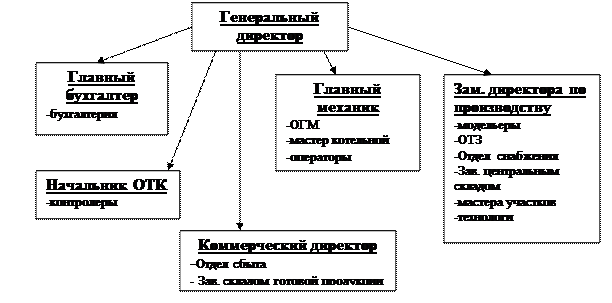 Итак, как мы можем видеть из таблицы, объем производства имеет тенденцию к росту, в связи с этим увеличивается и валовая выручка предприятия. Особо хотелось бы отметить сильный скачок в 2000 году. На мой взгляд, это связано с покупкой нового итальянского оборудования, что позволило значительно увеличить объемы выпускаемой продукции. 1.6. Основным видом деятельности общества является производство и реализация обуви. Если рассматривать рынки сбыта продукции ОАО "Йошкар-олинская обувная фабрика" с точки зрения географии, то можно сделать следующий вывод – для обувной фабрики характерен национальный (совокупный внутренний) рынок сбыта. Продукция фабрики реализуется как на территории республики посредством фирм и магазинов в городе Йошкар-Ола, поселке Сернур, выездной торговли, так и в других регионах России (Волго-Вятский район, районы Севера, Дальнего Востока). Продукция предприятия пользуется широким спросом. Основными потребителями и заказчиками ОАО «Йошкар-олинской обувной фабрики» являются: 1. Силовые министерства МВД. Фабрика принимает заказы на изготовление форменной обуви для тыловых служб, спец заказы на обмундирование военных частей на Дальнем Востоке, Западной Сибири. 2. Предприятия лесохозяйственного комплекса республики Марий Эл, ульяновской, кировской областей. 3. Московская фирма «Спец обувь», каждый год делает заказы на производство 20 000 штук мужского обмундирования. За последние 1,5-2 года в производственной деятельности предприятия ОАО "Йошкар-олинская обувная фабрика" произошли крупные изменения: 1. В 2000 году было закуплено новая итальянская линия оборудования за 150 000 долларов для производства 15 000 пар в месяц. 2. Разработана новая модель ботинок - "Гарант", высокого качества и эстетичного внешнего вида. 3. Открыта новая торговая точка в поселке Сернур. 4. Продукция предприятия на 13 Федеральной оптовой ярмарке «Рослегропрома» за высокие потребительские свойства получила диплом «Союзэкспертиза» Торгово-промышленной палаты Российской Федерации и удостоена диплома и серебряной медали на второй международной выставке «Лучшие товары и услуги на рынках России» за конкурентоспособную продукцию. На сегодняшний момент предприятие работает ритмично. Заметен существенный рост, почти в 2 раза, валовой выручки предприятия (с 20147 в 1999 году до 37726 в 2001). Прибыль также имеет тенденцию роста. (подробный анализ см. 5.1.) 2. ОРГАНИЗАЦИОННАЯ СТРУКТУРА УПРАВЛЕНИЯ ОАО "ЙОШКАР-ОЛИНСКАЯ ОБУВНАЯ ФАБРИКА" Организационная структура управления ОАО "Йошкар-олинская обувная фабрика" представлена на рис. 1.