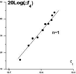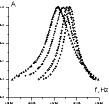 Пьезокерамический излучатель слабой волны (2) был приклеен к торцу образца (1) и массивному (М = 2 кг) титановому концентратору (4), являющемуся излучателем мощной волны накачки (ее минимальный уровень превышал максимальный уровень слабой волны примерно на 30 дБ), так что граничное условие на этом торце резонатора было близко к условию на абсолютно жесткой поверхности. К другому концу стержня приклеивался пьезоакселерометр (6) достаточно малой массы, так что эта граница была близка к акустически мягкой. Для таких резонаторов спектр собственных частот определяется следующим выражением: fn =c0 (2n‑1)/4L , где c0 - скорость продольной волны в стержне, n = 1,2…- номер продольной моды резонатора. С пьезоакселерометра сигнал поступал на спектроанализатор (10) для измерения амплитуды накачки, а также через режекторный фильтр (9), подавляющий сигнал на частоте накачки на 30 дБ, на селективный вольтметр (8) и осциллограф (7), где производилось измерение уровня слабого сигнала. Собственные частоты первых продольных мод резонатора при малых амплитудах возбуждения составляли соответственно 2250 Гц, 6800 Гц, 10150 Гц и 16650 Гц, а добротности - 45, 90, 81 и 93. Таким собственным частотам соответствует c0 »2500 м/с. Измерения проводились для слабой волны на 4-й моде резонатора и для накачки на 1-й моде, а также - наоборот. На рис.3 приведены резонансные кривые для слабой волны на 4-й моде в присутствии накачки на 1-й моде при различных ее амплитудах. Видно, что с ростом амплитуды волны накачки происходит сдвиг резонансной частоты и расширение резонансной кривой, т.е. уменьшение добротности резонатора