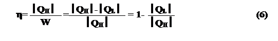 , где W - полезная работа совершенная этой машиной, QH - теплота сообщенная этой машине (Q взято под знак модуля, в связи с тем, что тепловой поток может иметь разное направление). По закону сохранения энергии получаем соотношение: ½QH ½=W+½QL ½ , где ½QL ½ - количество теплоты отводимой при низкой температуре.