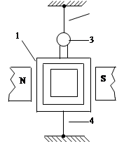Рис. 3.25. Схематическое устройство гальванометра на подвесе Гальванометры широко используются в качестве нуль-индикаторов, а также для измерения малых токов, напряжений и количеств электричества, если известна постоянная гальванометра. Кроме магнитоэлектрических существуют и некоторые другие виды гальванометров, например электростатические, называемые электрометрами. Однако их применение весьма ограничено. Основное требование, предъявляемое к гальванометрам, — высокая чувствительность, которая достигается, главным образом, путем уменьшения противодействующего момента и использования светового указателя с большой длиной луча. По конструктивному оформлению различают: а) гальванометры переносные (со встроенной шкалой), в которых используются как стрелочные, так и световые указатели; б) гальванометры зеркальные, с отдельной шкалой, требующие стационарной установки по уровню. В переносных гальванометрах подвижная часть устанавливается на растяжках, а в зеркальных — на подвесе (рис. 3.25). В последнем случае токоподвод к обмотке рамки 1 осуществляется посредством подвеса 2 и безмоментной нити 4. Для измерения угла поворота рамки служит зеркальце 3, на которое фокусируется луч света от специального осветителя. Постоянная зеркального гальванометра данной конструкции зависит от расстояния между зеркальцем и шкалой. Ее условились выражать для расстояния, равного 1 м, например: С1 = 1,2*10-6 А*м/мм. Для переносных гальванометров в паспорте указывают цену деления шкалы, например: 1 деление = 0,5*10-6 А. Наиболее чувствительные современные зеркальные гальванометры имеют постоянную до 10-11 А*м/мм; у переносных гальванометров постоянная составляет примерно 10-8 — 10-9 А/дел. Стандарт на гальванометры (ГОСТ 7324 — 68) допускает отклонение постоянной (или цены деления) от указанной в паспорте на ±10%. Важной характеристикой гальванометра является постоянство, нулевого положения указателя, под которым понимают невозвращение указателя к нулевой отметке при плавном его движении от крайней отметки шкалы. По этому параметру гальванометры делят на разряды постоянства. Условное обозначение разряда постоянства нулевого положения указателя гальванометра, состоящее из цифрового обозначения разряда постоянства, заключенного в ромб, наносят на шкалу гальванометра при маркировке. Многие гальванометры снабжают магнитным шунтом. Регулируя положение шунта посредством выведенной наружу ручки, можно менять значение магнитной индукции в рабочем зазоре. При этом изменяется постоянная, а также ряд других параметров гальванометра. По требованию стандарта, магнитный шунт должен изменять постоянную по току не менее чем в 3 раза. В паспорте гальванометра и в его маркировке указывают значения постоянной при двух крайних положениях шунта — полностью введенном и полностью выведенном. Гальванометр должен иметь корректор, перемещающий при круговом вращении указатель в ту или другую сторону от нулевой отметки. Гальванометры с подвижной частью на подвесе должны быть снабжены арретиром (приспособлением для механической фиксации подвижной части), который включают, например, при переноске прибора. Гальванометры ввиду высокой чувствительности необходимо защищать от помех. Так, от механических сотрясений гальванометры защищают, устанавливая их на капитальные ст