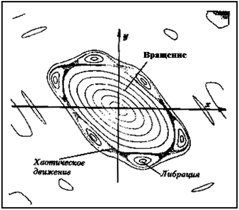 В центре графика показаны орбиты, отвечающие малым значениям параметра возмущения; они представляют собой замкнутые гладкие кривые. Во внешней области появляются шесть областей устойчивости, внутри которых структура похожа на ту, которая имеется в центре. Вокруг каждого из островов устойчивости существует область неустойчивости, хаотическая зона. Она соответствует области колебания маятника вблизи границы, где движения сильно зависят от начальных условий и могут быть очень нестабильны. Приведенный рисунок получен в результате численного моделирования на ЭВМ и полностью согласуется с результатами теорий Пуанкаре и КАМ. Рисунок тем и замечателен, что он был теоретически описан математиками еще до появления ЭВМ. ГИПЕРИОН И ПОЯС АСТЕРОИДОВ КАК ИЛЛЮСТРАЦИЯ ХАОТИЧЕСКОГО ДВИЖЕНИЯ. РЕЗОНАНСЫ В ДВИЖЕНИИ НЕБЕСНЫХ ТЕЛ. Теоретическое существование хаотических режимов движения в системах, подчиняющихся законам небесной механики, совсем не означает, что эти режимы должны обязательно наблюдаться. Их можно наблюдать только в том случае, если орбитальные параметры каких-то тел Солнечной системы существенно меняются за время, много меньшее возраста самой этой системы. Одним из первых примеров можно взять поведение Гипериона, спутника Сатурна, фотографии которого были получены в 1981 г. космическим зондом «Вояджер-2». Гиперион представляет собой бесформенную глыбу, длина которой вдвое больше ширины (самый малый поперечный размер 200 км.). Хаотическая форма Гипериона объясняется существованием области неустойчивости при движении в системе Гиперион – Титан – Сатурн, да и сам Гиперион хаотично вращается вокруг своей оси. Сечение Пуанкаре траектории Гипериона, рассчитанное на ЭВМ, соответствует стационарной орбите, возникающей в результате резонанса движений двух спутников Сатурна – Титана и Гипериона (резонансом в данном случае является такое движение спутников вокруг планеты, когда время обращения одного кратно времени обращения другого). Однако, если начальные условия совсем немного отличаются от тех, которые соответствуют этой орбите, траектории попадают в зону неустойчивости. Тело, помещенное на неустойчивую орбиту, будет рано или поздно выброшено из системы Сатурн – Титан – Гиперион при сближении с Титаном. Итак, теперь можно дать объяснение бесформенности Гипериона. За время своего существования Гиперион испытал многократные столкновения со сравнительно небольшими телами, обильно населяющими окрестности Сатурна. Куски Гипериона, которые были отколоты в результате таких ударов, собрались вокруг него под действием сил гравитации в гигантское облако. Однако благодаря наличию зоны неустойчивости вблизи орбиты Гипериона, эти осколки не упали обратно на Гиперион, а были постепенно (за время, много меньшее времени жизни самого Гипериона) выброшены из системы Сатурн – Титан – Гиперион в окружающее пространство. Есть и другой тип неустойчивости при движении тел в Солнечной системе. Большинство спутников планет и даже одна из планет (Меркурий) совершают движения, жестко определяющиеся резонансом между вращением вокруг оси и обращением вокруг планеты или Солнца: за время полного оборота по орбите они обращаются вокруг своей оси целое число раз. Именно по этой причине Луна повернута к нам всегда одной стороной. Она вра