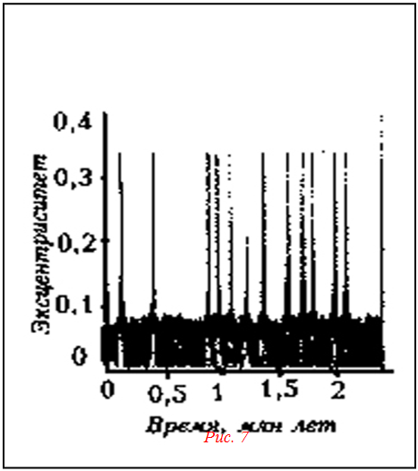 На рисунке 7 изображены результаты численного моделирования эволюции орбиты астероида, отвечающей резонансу 1:3. Они демонстрируют, что на протяжении миллионов лет возникают сильные прерывистые всплески значений эксцентриситета орбиты. В период такого всплеска астероид может пересечь орбиту Марса и под влиянием тяготения этой планеты оказаться выброшенным из устойчивой зоны, превратившись в астероид-бродягу. Благодаря этому возможно образование лакун в распределении орбит астероидов. НЕУСТОЙЧИВОСТЬ В ДВИЖЕНИИ КОМЕТ. Возмущения, вызываемые наличием планет, сильно влияют и на движение комет. В частности, последнее прохождение кометы Галлея в 1985 г. вызвало появление многочисленных работ по динамике движения комет с большим эксцентриситетом орбит. Предсказания появление кометы Галлея всегда были вызовом астрономам, с того самого момента, когда Эдмунд Галлей предсказал в 1705 г., что комета вернется примерно через 75 лет. Действительно, с тех пор появления кометы были регулярными с периодом 75-80 лет, но точное значение периода зависит от возмущающего действия на орбиту кометы со стороны планет, оказывающихся поблизости в данное время. По случаю последнего появления кометы были сделаны новые расчеты ее орбиты с использованием всей мощи современной вычислительной техники. Их точность составляла один год по шкале времени. Выяснилось, что расчеты очень хорошо совпадают с предшествующими наблюдениями появления кометы вплоть до 1403 г. с периодом 86 лет. Однако историкам астрономии удалось датировать появления кометы Галлея, начиная с 163 г. И тут выяснилось, что этот момент времени как раз соответствует границе зоны неустойчивости. Если расхождение расчетов и наблюдений на промежутке времени в 615 лет, считая от 163 г., равно всего двумстам дням, то за последующие семьсот лет – до 1403 г. – увеличивается до пяти лет. Все эти особенности движения кометы Галлея нашли свое объяснение в том, что эти движения неустойчивы. В рамках простой модели, в которой влияние Юпитера описано короткими импульсами в моменты прохождения кометы, было показано, что орбита кометы Галлея соответствует сепаратиссе на рисунке 8б. Комета Галлея – рядовая комета Солнечной системы. Во всех случаях проблема одна и та же: кометы «смертны». Это означает, что в результате развития неустойчивости орбиты комета может быть рано или поздно выброшена за пределы Солнечной системы.