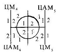 Внутри внешней сферы находится средняя сфера. Внутри средней сферы находится центральная сфера. Каждая из сфер делится на четыре части и обозначена Рис. 22 цифрами 1 и 2. Четвертую часть сферы, состоящую из одного типа атомов и окруженную со всех сторон другими типами атомов, я назвал миром. А сферу из четырех атомов – сферой миров.