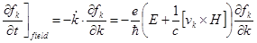 f0 k = 1/{exp[(E k – z)/kT] + 1} (43) Здесь нужно проявить некоторую осторожность. Именно, как определить функцию f0 k в случае, когда температура зависит от координат? Будем считать, что в каждой точке можно корректно определить локальную температуру T(r), и положим gk(r)=fk (r) – f0 k {3T(r)}. (44) Если введение локальной температуры вызывает затруднения, можно потребовать, чтобы окончательное решение удовлетворяло какому-либо дополнительному условию, например ògk (r)dk = 0. (45) Подставляя выражение (42) в кинетическое уравнение (41) и используя равенства (7.2) и (7.5), получаем – vk ×¶fk /¶r – e /ħ(E + 1/c[vk ´ H]) ×¶fk /¶k = – ¶fk /¶t]scatt , (46) или – vk ×¶fk /¶T ÑT – e /ħ(E + 1/c[vk ´ H]) ×¶ f0 k /¶k = – ¶fk /¶t]scatt + vk ×¶gk /¶r + e /ħ(E + 1/c[vk ´ H]) ×¶gk /¶k. (47) С помощью формулы (43) это уравнение можно переписать в виде (¶f0 /¶E)vk ×{( E (k) – z) / T×ÑT + e (E – 1/e×Ñz)} = – ¶fk /¶t]scatt + vk ×¶gk /¶r + e /ħc[vk ´ H] ×¶gk /¶k. (48) Это — линеаризованное уравнение Больцмана. В нем опущен член (E×¶gk /¶k) порядка E2 , соответствующий отклонениям от закона Ома. Отброшен также член vk [vk ´ H], тождественно равный нулю; в левую часть уравнения магнитное поле явно не входит. Подставляя выражение (40) в уравнение (48), можно убедиться, что мы получили линейное интегро-дифференциальное уравнение относительно «добавки» gk