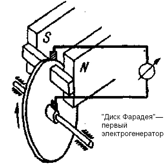 Первый примитивный электрогенератор создал сам Фарадей. Для этого он поместил медный диск между полюсами N и S постоянного магнита. При вращении диска в магнитном поле в нем наводились электрические токи. Если на периферии диска и в его центральной части помещали токоприемники в виде скользящих контактов, то между ними появлялась разность потенциалов, как на гальванической батарее. Замыкая цепь, можно было наблюдать на гальванометре непрерывное прохождение тока. Установка Фарадея годилась только для демонстраций, но вслед за ней появились первые магнитоэлектрические машины (так стали называть электрогенераторы, в которых использовались постоянные магниты), рассчитанные на создание работающих токов. Самой ранней из них была магнитоэлектрическая машина Пиксии, сконструированная в 1832 году. Принцип ее действия был очень прост: мимо неподвижных, снабженных сердечниками катушек двигались посредством кривошипа и зубчатой передачи лежащие против них полюсы подковообразного магнита, вследствие чего в катушках индуцировались токи. Недостатком машины Пиксии было то, что в ней приходилось вращать тяжелые постоянные магниты. В последующем изобретатели обычно заставляли вращаться катушки, оставляя магниты неподвижными. Правда, при этом приходилось решать другую задачу: каким образом отвести во внешнюю цепь ток с вращающихся катушек? Это затруднение, однако, было легко преодолимо. Прежде всего, катушки соединяли между собой последовательно одними концами их проводки. Тогда другие концы могли служить полюсами генератора. Их соединяли с внешней цепью при помощи скользящих контактов. Он устроен следующим образом: на оси машины крепились два изолированных металлических кольца, каждое из которых было соединено с одним из полюсов генератора. По окружности этих колец вращались две плоские металлические пружины, на которые была заключена внешняя цепь. При таком приспособлении уже не было никаких затруднений от вращения оси машины ток переходил из оси в пружину в месте их соприкосновения. Еще одно неудобство заключалось в самом характере тока электрогенератора. Направление тока в катушках зависит от того, приближаются они к полюсу магнита или удаляются от него. Из этого следует, что ток, возникающий во вращающемся проводнике, будет не постоянным, а переменным. По мере приближения катушки к одному из полюсов магнита сила тока будет нарастать от нуля до какого-то максимального значения, а затем по мере удаления вновь уменьшаться до нуля. При дальнейшем движении ток изменит свое направление на противоположное и опять будет нарастать до какого-то максимального значения, а потом убывать до нуля. Во время следующих оборотов этот процесс будет повторяться. Итак, в отличие от электрической батареи, электрогенератор создает переменный ток, и с этим приходится считаться. Как известно, большинство современных электрических приборов созданы таким образом, чтобы питаться от сети переменного тока. Но в XIX веке переменный ток был не удобен по многим причинам, прежде всего психологическим, поскольку в прежние годы привыкли иметь дело с постоянным током: Впрочем, переменный ток можно было легко преобразовать в прерывистый, имеющий одно направление. Для этого достаточно было с помощью специального устройства коммутатора изменить контакты 