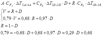 Σ(1/ΔТср ) = 0,192 ΔТср = 10/0,245 = 52 К г) Материальный баланс теплообменника IV: (VК – Vдк )(i6В – i5B ) + Vq3 = К(i4 – i2К ) Из баланса расчитываем истинное значение теплопритоков из окружающей среды: (0,56 – 0,1)*2,204(188 - 138) + 1*q3 = 0,128*1,742(123 – 88) q3 = 7,804 - 50,7 = - 42,9 кДж/кг Рассчитываем коэффициенты В и D: (VК – Vдк )(i6В – i5B ) + Vq3 = К(i4 – i2К ) (Vк - Vдк ) ΔiB + Vq3 = К Δiк ΔiB = К Δiк / (VК - Vдк ) - V q3 /VК | ΔiК / ΔiК ΔiB = К ΔiК / (VК - Vдк ) - Vq3 * ΔiК / ΔiК В =К/(VК - Vдк ) = 0,128/0,46 = 0,278 D = V q3 /(VК - Vдк ) Δiк = -1*42,9/0,46*(372,6 – 332) = - 1,297 ΔiB = В ΔiК - в ΔiК = С Δiк = (0,278 + 1,297) ΔiК = 1,488 ΔiК Составляем таблицу: