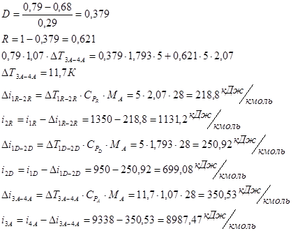 ПРИМЕЧАНИЕ. 1. Значения энтальпий для точек 1R, 2R, 3R , 1D, 2D взяты из номограммы Т – i – P – x – y для смеси азот – кислород. 2. Прочие значения энтальпий взяты из [2].