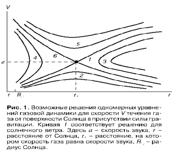 - расстояние от начала координат, на котором скорость газа равна скорости звука (V = a). Очевидно, что только кривые 1 и 2 на рис1. имеют физический смысл для проблемы истечения газа из Солнца, поскольку кривые 3 и 4 имеют неединственные значения скорости в каждой точке, а кривые 5 и 6 соответствуют очень большим скоростям в солнечной атмосфере, что не наблюдается в телескопы. Паркер проанализировал условия, при которых в природе осуществляется решение, соответствующее кривой 1. Он показал, что для согласования давления, получаемого из такого решения, с давлением в межзвездной среде наиболее реален случай перехода газа от дозвукового течения (при r < r*