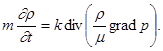 (27) Для того чтобы получить замкнутую систему уравнений, нужно воспользоваться тем, что свойства жидкости (плотность r и вязкость m), так же как и пористость и проницаемость пористой среды, являются функциями давления (мы предполагаем движение изотермическим).