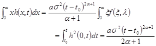 (70) Таким образом, из требования непрерывности расхода следует непрерывность функции df2 /dx. При непрерывной функции f(x) и f ¹ 0 требование непрерывности функции df2 /dx = 2fdf/dx совпадает с требованием непрерывности производной df/dx. Однако при f = 0 из непрерывности df2 /dx непрерывность df/dx не вытекает. Напротив, как увидим далее, искомая функция f(x, l) имеет в точке, где f обращается в нуль, разрыв первой производной. Условие (69) удобнее привести к другому виду. Умножим обе части основного уравнения (62) на х и проинтегрируем по х от нуля до бесконечности. В результате получим