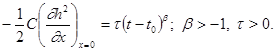 (62) получающемуся из общего уравнения Буссинеска (47) для данных геометрических условий задачи, а также граничному условию (61), начальному условию и условию на бесконечности: h(x, t0 ) = h(¥, t) = 0. (63)