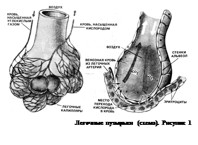 По краям голосовой щели в слизистой оболочке лежат фиброзные эластичные связки, которые называются нижними, или истинными, голосовыми складками (связками). Над ними находятся ложные голосовые складки, которые защищают истинные голосовые складки и сохраняют их влажными; они помогают также задерживать дыхание, а при глотании препятствуют попаданию пищи в гортань. Специализированные мышцы натягивают и расслабляют истинные и ложные голосовые складки. Эти мышцы играют важную роль при фонации, а также препятствуют попаданию каких-либо частиц в дыхательные пути. Трахея начинается у нижнего конца гортани и спускается в грудную полость, где делится на правый и левый бронхи; стенка ее образована соединительной тканью и хрящом. У большинства млекопитающих хрящи образуют неполные кольца. Части, примыкающие к пищеводу, замещены фиброзной связкой. Правый бронх обычно короче и шире левого. Войдя в легкие, главные бронхи постепенно делятся на все более мелкие трубки (бронхиолы), самые мелкие из которых, конечные бронхиолы являются последним элементом воздухоносных путей. От гортани до конечных бронхиол трубки выстланы мерцательным эпителием. В целом легкие (рис. 1) имеют вид губчатых, пористых конусовидных образований, лежащих в обеих половинах грудной полости. Наименьший структурный элемент легкого - долька состоит из конечной бронхиолы, ведущей в легочную бронхиолу и альвеолярный мешок. Стенки легочной бронхиолы и альвеолярного мешка образуют углубления-альвеолы. Такая структура легких увеличивает их дыхательную поверхность, которая в 50-100 раз превышает поверхность тела.