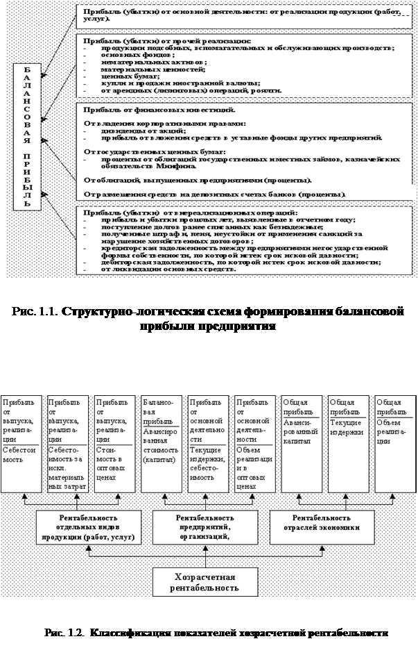 На рис. 1.2. (см. стр. 14) приведена классификация показателей хозрасчетной рентабельности. При исчислении рентабельности отдельных видов продукции (работ, услуг) может приниматься прибыль от их выпуска или реализации. При этом текущие издержки могут приниматься в следующих вариантах: · себестоимость (производственная или полная); · себестоимость за исключением материальных затрат (рентабельность по отношению к вновь созданной стоимости); · стоимость в оптовых ценах (стоимость за минусом непрямых налогов). Для расчета уровня рентабельности предприятий может использоваться: балансовая прибыль; прибыль от реализации продукции (работ, услуг), т.е. от основной деятельности; других видов деятельности (финансовой, инвестиционной деятельности). При этом прибыль сопоставляется с авансированной стоимостью, которая может приниматься в нескольких вариантах (весь капитал предприятия, собственный капитал, заемный капитал, основной капитал, оборотный капитал). Для расчета рентабельности отраслей экономики в расчет принимается общая сумма прибыли, полученная предприятиями, объединениями; другими хозрасчетными формированиями, входящими в соответствующую отрасль экономики. На уровень рентабельности отрасли будут оказывать влияние наличие в ней низкорентабельных и убыточных предприятий.