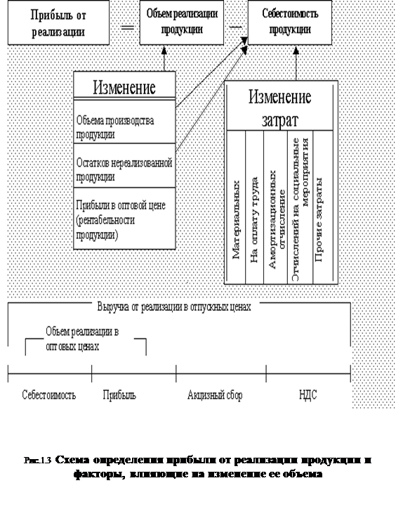 1.2 Роль прибыли в формировании финансовых ресурсов предприятия. Как уже отмечалось выше, получение прибыли от реализации продукции (работ, услуг) связано с осуществлением основной деятельности субъектов хозяйствования. Прибыль входит в состав выручки от реализации. Поэтому ее формирование связано с поступлением выручки от реализации. Однако в отличие от выручки, поступление которой на расчетный счет фиксируется регулярно, объем полученной прибыли определяется только за определенный период (месяц, квартал, год) на основе данных бухгалтерского учета. Реально формирование прибыли на предприятии происходит по мере реализации продукции. Поэтому в обороте предприятия прибыль появляется до ее отражения в отчетности. Для формирования прибыли важное значение имеет определение момента реализации продукции. В отдельных законодательных актах по разному трактуется момент реализации. Однако независимо от принятой трактовки момента реализации в законодательных актах, формирование на предприятии прибыли от реализации продукции имеет место только при условии реальной реализации, т.е. при зачислении средств от покупателя на расчетный счет поставщика. Определение момента реализации по дате отгрузки товаров и связанное при этом возникновение налоговых обязательств сопровождается отвлечением оборотных средств предприятий на уплату налогов, ухудшением их финансового состояния. На рис.1.3 (см. стр. 17) приведена структурно-логическая схема формирования прибыли от реализации продукции, а также названы основные показатели, влияющие на прибыль от реализации. Прибыль от реализации продукции непосредственно зависит от двух основных показателей: объем реализации продукции, себестоимость продукции . На изменение объема реализации продукции влияет изменение: объема производства, остатков нереализованной продукции, прибыли в цене продукции (рентабельность продукции). Необходимо обратить внимание на то, что изменение объема производства продукции, остатков нереализованной продукции оказывают влияние не только на объем реализации продукции, но и на ее себестоимость. Это достигается через: изменение условно-постоянных расходов (при изменении объема производства продукции); изменение расходов по хранению продукции и других расходов (при изменении остатков нереализованной продукции). Существенное влияние на объем реализации продукции, а также непосредственно и прибыль от реализации оказывает размер прибыли, включаемой в цену продукции. В условиях формирования рыночной экономики, отменено в большинстве случаев государственное регулирование рентабельности продукции, создается возможность регулирования прибыли за счет указанного фактора. Этому способствует отсутствие достаточной конкуренции при производстве и реализации многих видов продукции. Таким образом, можно сделать вывод, что возможность предприятий влиять на объем прибыли от реализации через изменение объемов производства продукции, остатков нереализованной продукции, рентабельность продукции является существенной. Рассмотрим особенности влияния на формирование прибыли себестоимости продукции (работ, услуг). Себестоимость является обобщающим, качественным показателем деятельности предприятий, показателем ее эффективности.