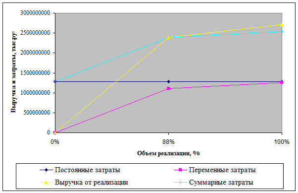 Как видно из расчетов произведенных в таблице 15, за 1996 год нужно было реализовать продукции на сумму 2386915333 тыс.руб., чтобы покрыть все затраты. При такой выручке рентабельност равна нулю. Фактически выручка составила 2715067289 тыс.руб., что выше порога рентабельности на 328151956 тыс.руб., или на 12%. Это и есть запас финансовой устойчивости. За 1997 год запас финансовой устойчивости увеличился до 15% за счет существенного роста рентабельности продаж. Но все же запас финансовой устойчивости продолжает оставаться на сравнительно низком уровне, так как уже при падении выручки всего на 15% рентабельность будет равна нулю. При еще большем падении выручки предприятие станет убыточным. Наглядно зависимость этих показателей и определение запаса финансовой устойчивости показано на рисунке 6 (за 1996 год) и рисунке 7 (за 1997 год).