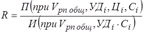 где Vрп общ - общий объем реализованной продукции; УДi - удельный вес i-го вида продукции в общем объеме; Цi - цена реализации i-го вида продукции; С i - себестоимость i-го вида продукции. Расчет влияние факторов первого порядка на изменение уровня рентабельности в целом по предприятию выполним способом цепных подстановок, используя данные таблицы 3.: