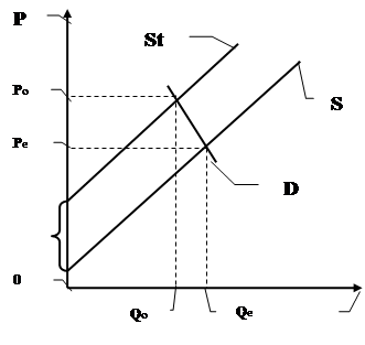 На рис. 1 графически показаны последствия отрицательных внешних эффектов для распределения ресурсов. Если не компенсируемые издержки составляют величину Т, то кривая фактического предложения S