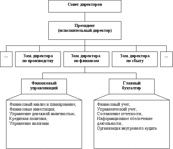 Приоритетность той или иной цели может выбираться предприятием в зависимости от отрасли, положения на данном сегменте рынка и от многого другого, но удачное продвижение к выбранной цели во многом зависит от совершенства управления финансовыми ресурсами предприятия. Логика функционирования управления финансовыми ресурсами представлена на рисунке 1.2. Организационная структура системы управления финансами хозяйствующего субъекта, а также ее кадровый состав могут быть построены различными способами в зависимости от размеров предприятия и вида его деятельности. Для крупной компании наиболее характерно обособление специальной службы, руководимой вице-президентом по финансам (финансовым директором) и, как правило, включающей бухгалтерию и финансовый отдел. На небольших предприятиях роль финансового менеджера обычно выполняет главный бухгалтер.