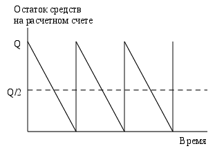 По банковским счетам, на которых фирмы держат свои ликвидные активы, процент не уплачивается. Однако другие ликвидные активы (краткосрочные государственные ценные бумаги, депозитные сертификаты, разновидность единовременного займа, называемая перекупочным соглашением) приносят доход в виде процентов. В западной практике наибольшее распространение получили модель Баумола и модель Миллера-Ора. Непосредственное применение этих моделей в отечественную практику пока затруднено ввиду сильной инфляции, аномальных учетных ставок, неразвитости рынка ценных бумаг и т.п., поэтому ниже приведено лишь краткое теоретическое описание данных моделей /9/. Модель Баумола. Предполагается, что предприятие начинает работать, имея максимальный и целесообразный для него уровень денежных средств, и затем постоянно расходует их в течение некоторого периода времени. Все поступающие средства от реализации товаров и услуг предприятие вкладывает в краткосрочные ценные бумаги. Как только запас денежных средств истощается, т.е. становится равным нулю или достигает некоторого заданного уровня безопасности, предприятие продает часть ценных бумаг и тем самым пополняет запас денежных средств до первоначальной величины. Таким образом, динамика остатка средств на расчетном счете представляет собой "пилообразный" график (рисунок 1.4).