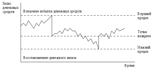 Рисунок 1.4 - График изменения остатка средств на расчетном счете (модель Баумола) Модель Баумола проста и в достаточной степени приемлема для предприятий, денежные расходы которых стабильны и прогнозируемы. В действительности такое случается редко; остаток средств на расчетном счете изменяется случайным образом, причем возможны значительные колебания. Модель, разработанная Миллером и Ором, представляет собой компромисс между простотой и реальностью. Она помогает ответить на вопрос: как предприятию следует управлять своим денежным запасом, если невозможно предсказать каждодневный отток и приток денежных средств? Логика действий по управлению остатком средств на расчетном счете представлена на рисунке 1.5.