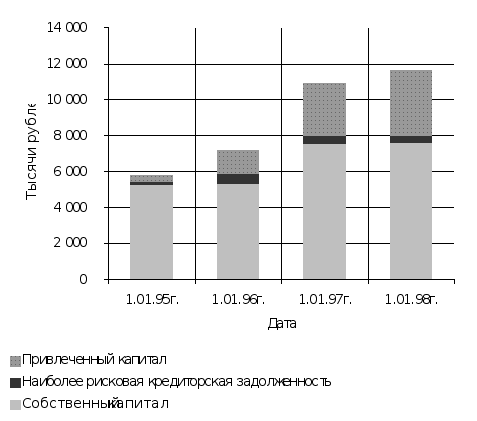 Рисунок 3.7 - Соотношение и динамика изменения источников финансовых ресурсов ОАО "Армхлеб" Задолженность по социальному страхованию и обеспечению возросла с 2 тыс.р. в начале исследуемого периода до 44 тыс.р. - в конце. Темп роста задолженности по социальному страхованию и обеспечению составил 2068,8%. Так же увеличилась на 80 тыс.р. задолженность по выплате заработной платы работникам и на 19 тыс.р. задолженность предприятия перед бюджетом. Темп роста задолженности по заработной плате составил 200,8%, а темп роста задолженности предприятия перед бюджетом составил 117,3%. Темпы роста задолженности по этим статьям значительны, но, как видно из рисунка 3.1 изменение суммы задолженности по этим статьям баланса не повлекло за собой значительного изменения структуры источников финансовых ресурсов из-за небольшой доле этих статей в общей сумме источников: 1,4%, 0,4% и 1,1% на 1.01.98г. соответственно. Сумма краткосрочных кредитов увеличилась с 153080 тыс.р. на начало анализируемого периода до 1287601 тыс.р. - в конце анализируемого периода, то есть на 1134521 тыс.р. Темп роста суммы краткосрочных кредитов составил 841,13%. Доля краткосрочных кредитов в общей сумме заемных средств на 1.01.95г. составила 27%, а к концу анализируемого периода увеличилась до 39%. Доля краткосрочных кредитов в сумме заемных средств довольно велика, но небольшая доля краткосрочных кредитов в общей сумме пассивов снижает их влияние на изменение структуры источников средств. В то же время, темп роста краткосрочных кредитов самый большой среди остальных статей источников финансирования. Задолженность перед прочими кредиторами уменьшилась на 7 т.р. и составила на конец исследуемого периода 91977 т.р. Как видно из рисунка 3.1, структура заемных источников финансовых ресурсов нельзя охарактеризовать однозначно. Наблюдается рост задолженности по так называемым "больным статьям" - задолженность по выплате заработной платы работникам, по социальному страхованию, задолженность перед бюджетом. Хотя задолженность по этим статьям баланса растет быстрыми темпами, сумма ее достаточно мала. Главной тенденцией в динамике источников средств предприятия ОАО "Армхлеб" является увеличение доли привлеченных финансовых ресурсов в общей сумме капитала при несущественном увеличении собственных источников. Рост доли привлеченных финансовых ресурсов может характеризовать финансовое состояние предприятия как с положительной так и с отрицательной стороны. Если предприятие имеет высокий уровень рентабельности, то увеличение доли привлеченных средств может свидетельствовать о повышении темпов роста оборота предприятия и, следовательно, недостатке средств на финансирование переменных, а зачастую и постоянных затрат. Но так же, высокая доля привлеченных ресурсов в пассиве предприятия может говорить о его низкой рентабельности и финансовой устойчивости. Анализ показателей рентабельности и финансовой устойчивости ОАО "Армхлеб" приведен в следующей главе. Финансовые ресурсы не присутствуют в явном виде в балансе предприятия, но расчет их суммы очень важен для оценки финансового состояния. Сравнение суммы финансовых ресурсов и затрат предприятия на производство продукции позволяет сделать вывод о их достаточности для обеспечения воспроизводственного процесса. Расчет суммы финансовых ресурсов ОАО "Армхлеб"