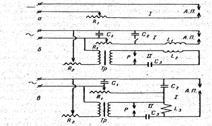 и клемм, подводящих ток от выпрямителя. Вольтметр и амперметр в этой и других схемах для лучшего восприятия материала упускаются. Рис.3. Принципиальные схемы дуговых генераторов: а—генератор дуги постоянного тока; б,в—генераторы активизированной дуги переменного тока с индуктивной (б) и автотрансформаторной (в) связью дугового (I)и высокочастотного (II) контуров. А.п.— аналитический промежуток; Р—разрядник; С—конденсаторы; L—-катушки; Тр—трансформаторы Из-за высокого сопротивления воздуха в аналитическом промежутке при подаче на него напряжения дуга не загорится. Для поджига дуги аналитический промежуток следует активизировать. Это достигается кратковременным сведением электродов либо с помощью токов высокой частоты, как в генераторе активизированной дуги переменного тока. Зажигание дуги и поддерживание ее горения происходят за счет термоэлектронной эмиссии с электродов. При анализе металлических сплавов анализируемый образец обычно подключают к отрицательному полюсу, катоду, а постоянный электрод - к аноду. При анализе горных пород и порошкообразных проб угольный электрод, в кратер которого обычно помещают пробу, включают анодом, так как его температура на несколько сот градусов выше катода. Активизированная дуга переменного тока. Дуговой разряд переменного тока не может поддерживаться самостоятельно между металлическими электродами, так как направление тока меняется 100 раз в секунду (50 Гц). За такой промежуток времени металлические электроды успевают остыть, и термоэлектронная эмиссия при этом не происходит, а дуга гаснет и не загорается. Для восстановления дуги в начале каждого полупериода тока ее необходимо зажигать с помощью высокочастотного тока(рис.3,б). Механизм действия высокочастотного контура генератора аналогичен высоковольтной конденсированной искре. Ток от вторичной цепи трансформатора заряжает конденсатор Сз, который затем разряжается на дополнительный разрядный промежуток Р. Возникающие при этом высокочастотные колебания с помощью катушек индуктивности L1 и L2 передаются в контур дуги переменного тока, ионизируя аналитический промежуток и способствуя поджигу и стабильному горению дуги. Если в контуре дуги уменьшить индуктивность катушки L1 и дополнительно включить емкость С2 , то получится новый режим возбуждения спектров — режим низковольтной искры, способный возбуждать искровые линии элементов с высокими потенциалами возбуждения. Связь дугового и высокочастотного контуров может быть осуществлена также и по автотрансформаторной схеме (рис.3в). Для этого катушки индуктивности L1 и L2 заменяют одной небольшой индуктивностью L3 и включают емкость C2 =l0 мкФ, которая обусловливает жесткий искровой режим. Высокочастотный режим возбуждения спектров получают путем закорачивания конденсатора С4 и отключения питания аналитического промежутка током низкой частоты. Все приведенные режимы реализуются в промышленных генераторах активизированной дуги переменного тока ДГ-2, ИВС-20, ИВС-28, ИВС-29. Фотоэлектрические установки типа квантометра комплектуются специальными генераторами с электронным управлением, например ГЭУ и УГЭ-4. Такие генераторы обеспечивают следующие режимы возбуждения спектра: дуга переменного тока, выпрямленная дуга различной полярности и скважности (соотношение времени го
