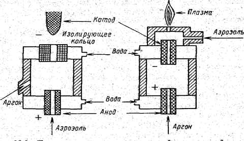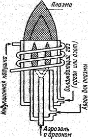 Кроме описанного аэрозольного способа возможно введение анализируемого вещества в виде раствора или порошка в основание струи плазмы, минуя камеру, в которой горит дуга. В качестве охлаждающих газов чаще используют аргон и реже — смесь гелия с аргоном, азот. Возможно возбуждение плазмы высокочастотными(Вч)и сверхвысокочастотными (СВч) токами. Вч- и СВч- плазматроны дают возможность получить низкотемпературную плазму (3400-—10000 К) в любых газах и смесях. На рис.5 представлены схемы таких плазматронов. Струя газа и аэрозоля исследуемого раствора подается в кварцевую трубку, охлаждаемую водой или газом. Разряд возбуждается с помощью высокочастотного индуктора, состоящего из нескольких витков медной трубки или волновода (Свч).