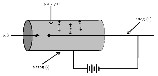 Поскольку период полураспада не зависит от количества радиоактивных атомов, то он остается постоянным в течение процесса распада. Таким образом, 50% радиоактивных атомов распадается за один период полураспада, 75% за два периода полураспада, и 87,5% за три периода полураспада. Кинетическая информация о радиоактивных изотопах обычно дается в рамках периода полураспада, потому что он обеспечивает более интуитивное чувство устойчивости изотопа. Знание, например, что константа распада для 2.1. А п п а р а т у р аa-частицы, b-частицы, g-лучи и рентгеновские лучи измеряются, используя энергию частиц, которая производит усиленный импульс электрического тока в датчике. Эти импульсы считаются, давая скорость разложения. Обычно сталкиваются с тремя типами датчиков: газо-ионизационные датчики , сцинтилляционные счетчики и полупроводниковые датчики . 2.1.1. Газо-ионизационные датчикиБольшинство газо-ионизационных датчиков состоит из заполненной инертным газом, таким как Ar, камеры с таким приложенным напряжением, что центральный провод становится анодом, а стенка камеры – катодом (Рис. 1). Когда радиоактивные частицы входят в трубку, они ионизируют инертный газ, производя большое число Ar+ /e- ионных пар. Движение электронов к аноду, а Ar+ к катоду производит измеряемый электрический ток. В зависимости от напряжения, приложенного к камере, датчики можно разделить на ионизационные камеры , пропорциональный счетчики и счетчики Гейгера-Мюллера (ГМ) .