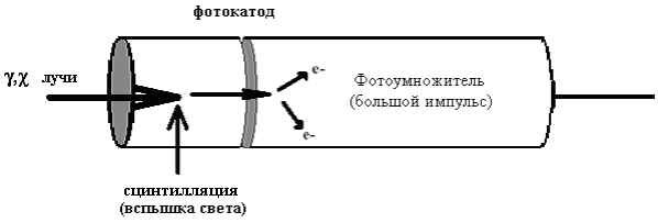 Рисунок 1. Изображение газо-ионизационного датчика. Из-за универсальности и надежности счетчик Гейгера-Мюллера наиболее широко используется как портативный исследовательский прибор. Он особенно чувствителен к b-частицам средней и высокой энергии (например, как от 32 P) давая эффективность счета 20 процентов. Счетчик ГМ также полезен в определении уровней излучения вблизи сравнительно больших (например, по крайней мере, порядка мкКи) источников g- или рентгеновских лучей средней и высокой энергии. Датчик ГМ, однако, не особенно чувствителен к низкоэнергетическим b-частицам (например, от 35 S и 14 C), давая эффективность не более 5 процентов, и при этом не очень чувствителен к низкоэнергетическим g- и рентгеновским лучам (например, от 125 I). Кроме того, ни ГМ, ни любой другой портативный дозиметр не способен обнаружить низкоэнергетические b-частицы от 3 H. 2.1.2. Сцинтилляционные счетчикиДействие сцинтилляционных счетчиков основано на том, что заряженная частица, пролетающая через вещество, вызывает не только ионизацию, но и возбуждение атомов. Возвращаясь в нормальное состояние, атомы испускают видимый свет. Вещества, в которых заряженные частицы возбуждают заметную световую вспышку (сцинтиллицию), называют фосфóрами . Сцинтилляционный счетчик состоит из фосфора, от которого свет подается по специальному светопроводу к фотоумножителю (Рис. 2). Импульсы, получающиеся на выходе фотоумножителя, подвергаются счету.