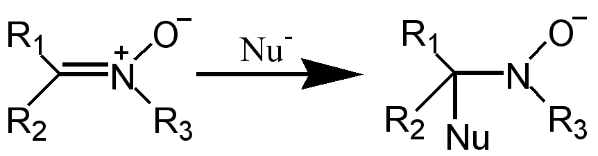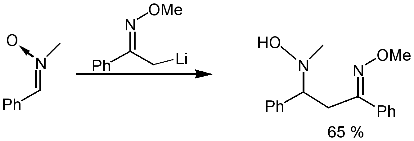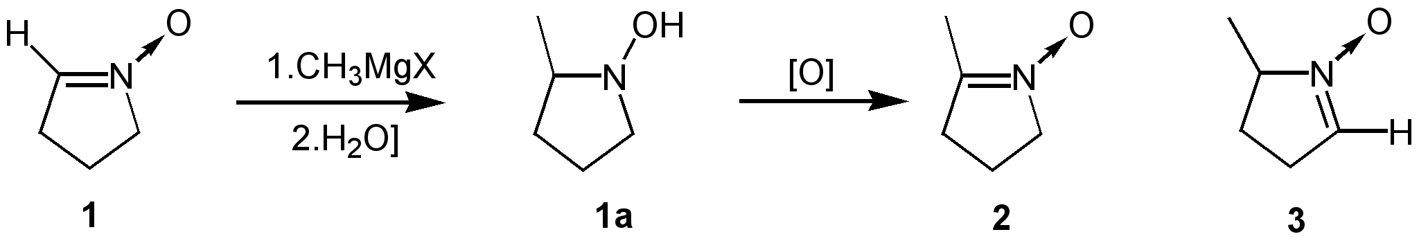 Дальнейшие исследования показали, что присоединение нуклеофилов к нитронам является общей реакцией и имеет большое синтетическое значение. Альдонитроны легко присоединяют металлоорганические соединения с образованием производных гидроксиламина. Так, пирролин-1-оксид 1 реагирует с метилмагнийиодидом с образованием гидроксиламина 1а, последующее мягкое окисление которого приводит к -кетонитрону 2. При этом образование изомерного альдонитрона 3 не наблюдается.14