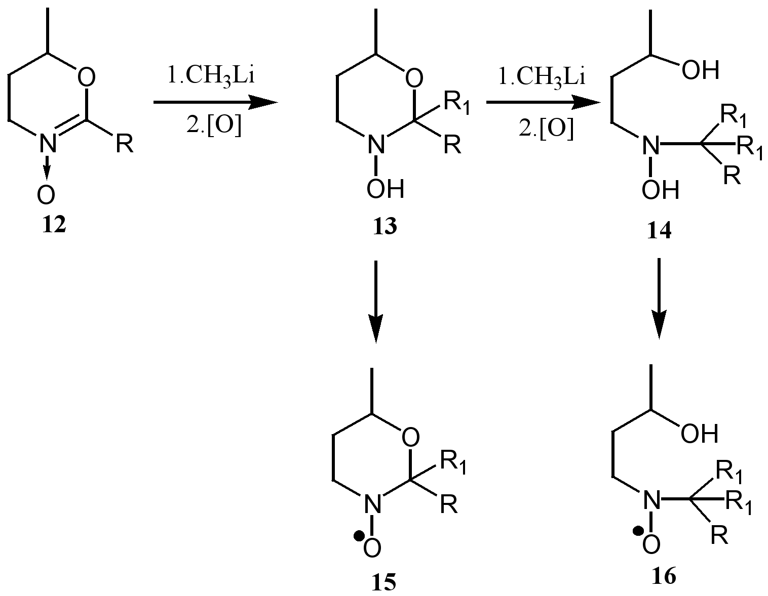 При взаимодействии -этилнитронов с литийорганическими соединениями продуктов металлирования нитронов не наблюдается, что связано, видимо, с меньшей кислотностью атома водорода метиленовой группы.20 Производные тетрагидрооксазин-N-оксида 12 способны к присоединению одного или двух молей алкиллития с образованием циклического 13 или ациклического 14 производного гидроксиламина. Последующее окисление в системе Сu2+/О2 позволило авторамError: Reference source not found получить соответствующие нитроксильные радикалы 15 и 16.