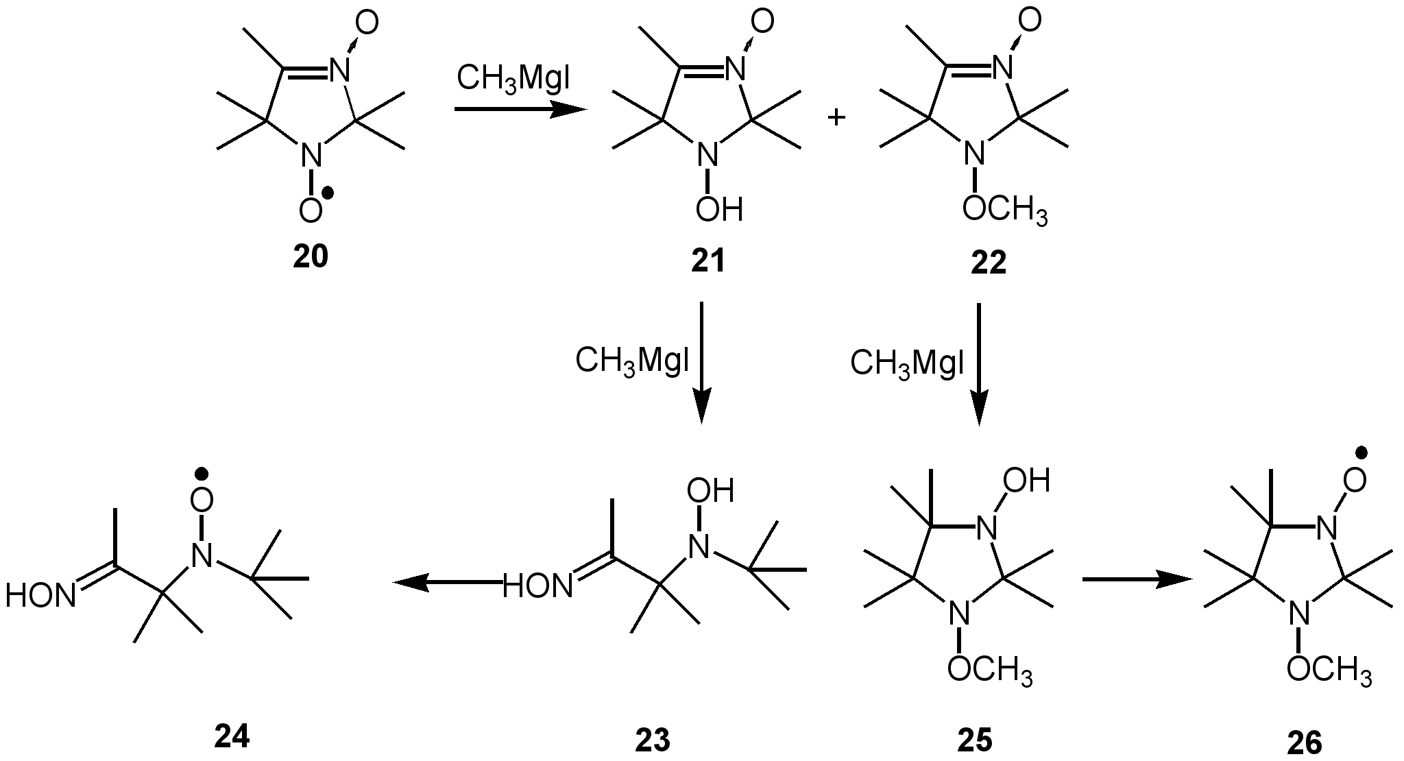 При переходе от CH3MgI к PhLi выход продукта дезоксигенирования 19 снижается с 75 до 8 %, в то время как выход продукта присоединения 18 возрастает с 7 до 60 %. Взаимодействие магнийорганических соединений с нитроном 20 ряда 3-имидазолин-3-оксида, содержащем в составе цикла нитроксильную группу, происходит с затрагиванием радикального центра.22 При этом образуются продукты восстановления нитроксильной группы 1-гидрокси-3-имидазолин-3-оксид 21 и 1-метоксизамещённое производное 3-имидазолин-3-оксида 22.Error: Reference source not found