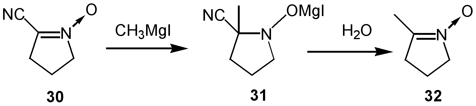 При изучении реакций магнийорганических соединений с 2-цианонитроном 30 было обнаружено, что в отсутствии пространственных затруднений со стороны заместителей в третьем положении пирролинового цикла, присоединение реактива Гриньяра происходит лишь по нитронной группе. Гидролиз продукта реакции присоединения 31 происходит с отщеплением MgICN и приводит к образованию -метилнитрона 32.24