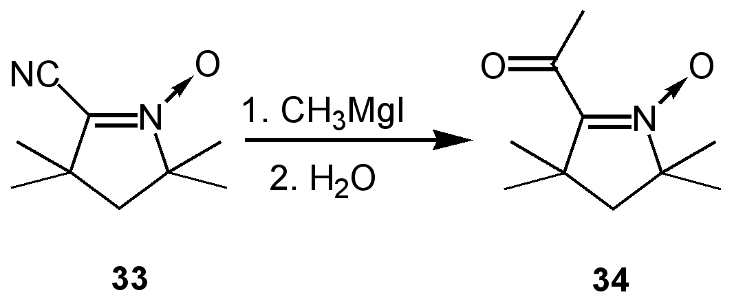 В случае 3,3,5,5-тетраметил-2-циано-пирролин-1-оксида 33, содержащего объемные гем-метильные группы в третьем положении цикла, реакция проходит лишь по нитрильной группе и приводит к образованию -кетоннитрона 34.