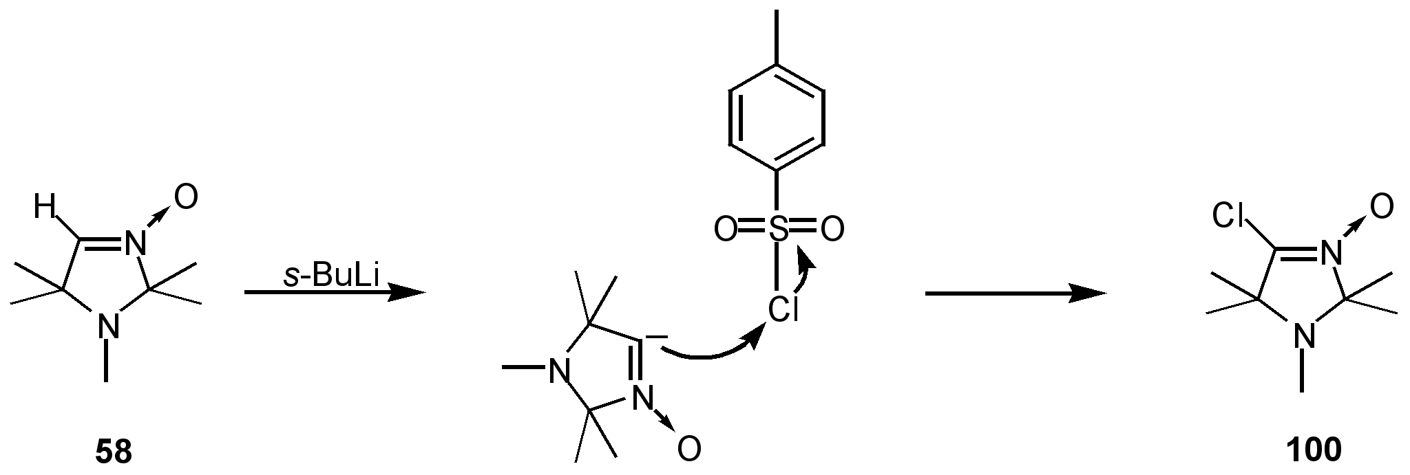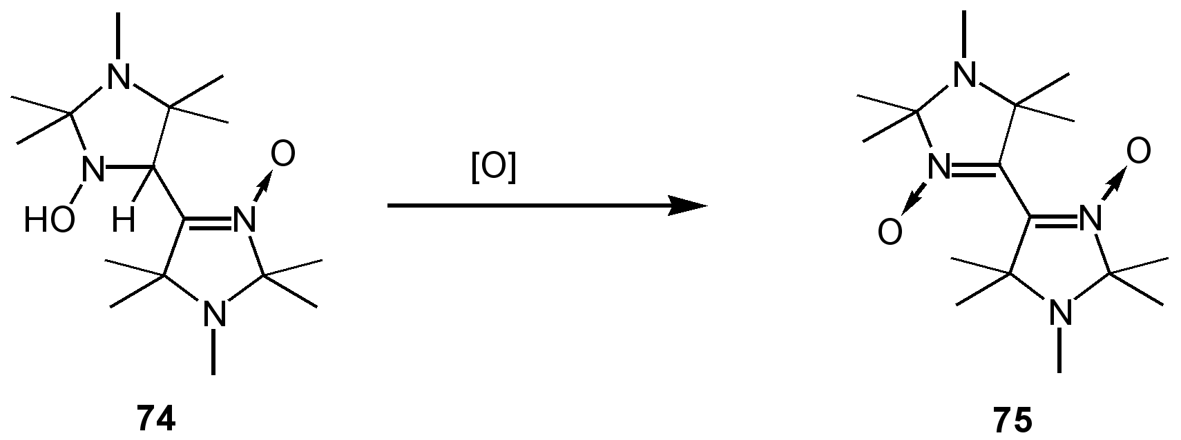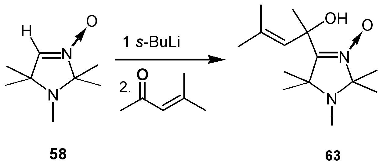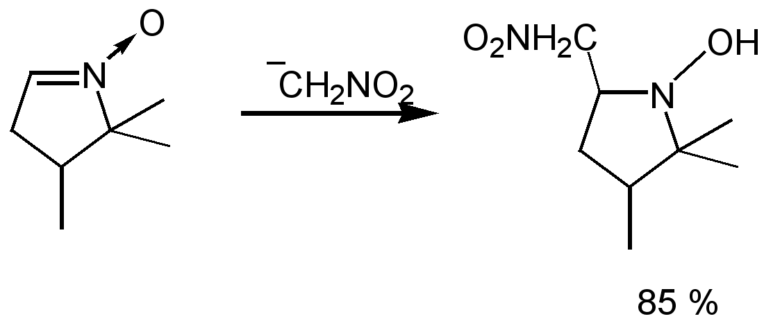 присоединение реактива Гриньяра к замещённым нитронам типа 4 приводит к образованию пространственно-затруднённого производного гидроксиламина 5, окисление которого приводит к стабильному нитроксильному радикалу 6. Часто окисление происходит настолько легко, что нитроксильный радикал является основным продуктом реакции и гидроксиламин не удаётся выделить вообще.15