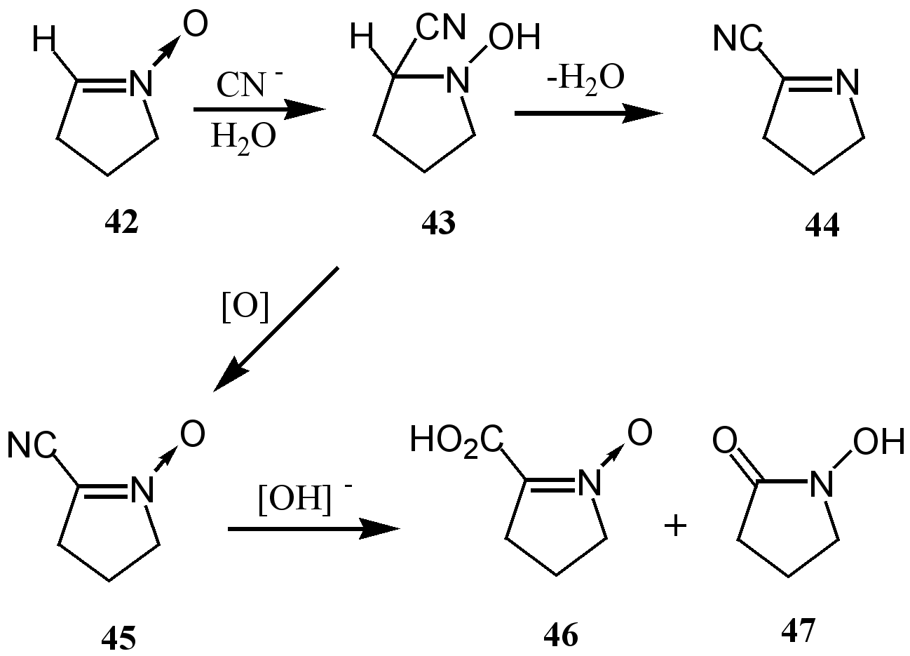 Альдонитроны легко присоединяют цианид-анион с образованием производных гидроксиламина, которые в случае ациклических нитронов самопроизвольно дегидратируются.29 В случае пирролин-1-оксида 42 продукт присоединения 43 может быть выделен. Циангидроксиламин 43 окисляется до цианонитрона 45, который в условиях щелочного гидролиза образует смесь карбоновой 46 и гидроксамовой 47 кислот.
